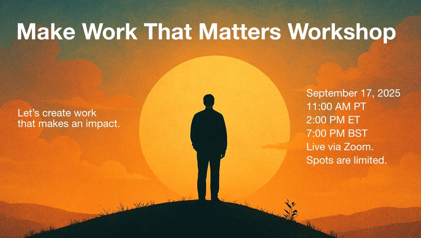In this one-hour Zoom session, we'll explore how to create work that makes an impact. I'll share key ideas, we'll do some exercises to put them into practice, and we'll learn from each other through discussion. By the end of the session, you'll leave with fresh energy and a clearer sense of how to make work that matters.